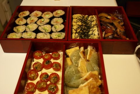 お重箱の中身は、豆腐とトマトのバジル味噌ソース、蒟蒻とおあげさんの生姜入り酢味噌和え、ナスのトマト煮込み、ニガウリの豆腐キッシュ、玄米巻き寿司(わさびアボガド、キムチきゅうり)